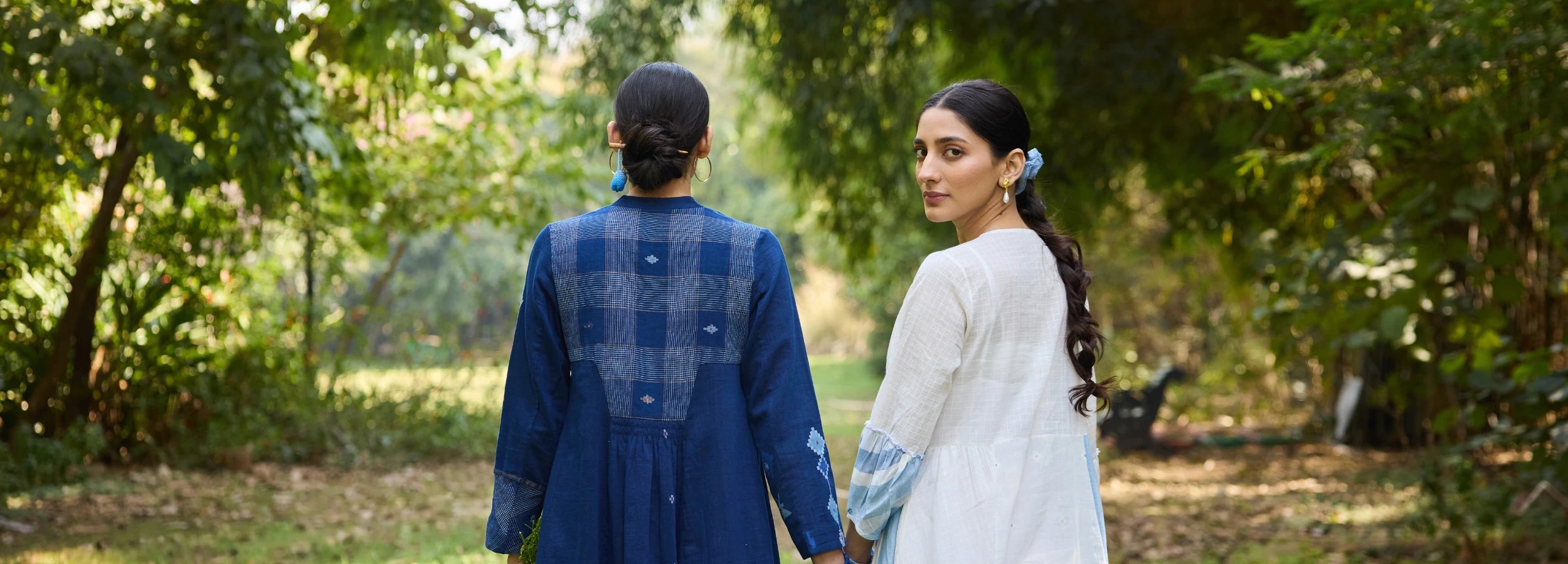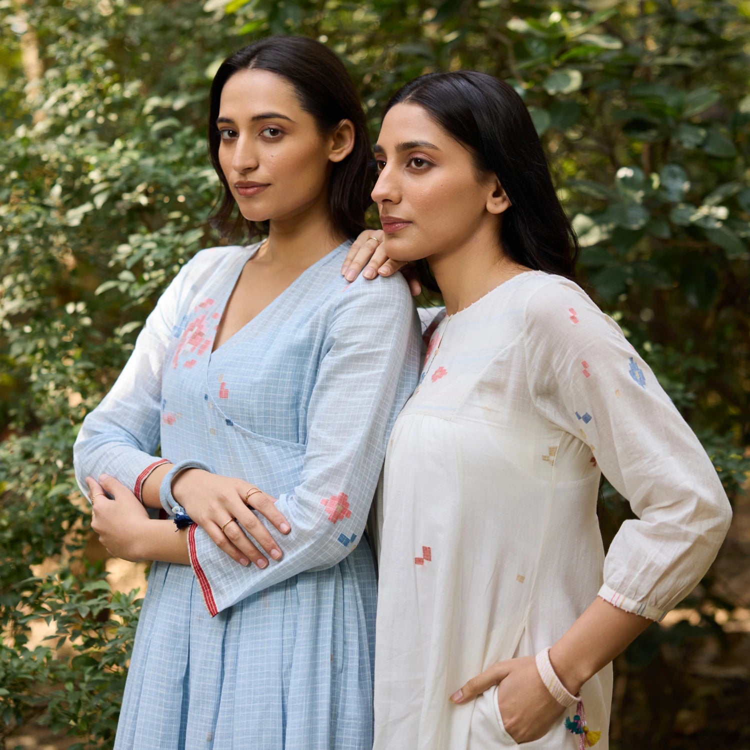 Round neckline with finely done pin-tuck detailing on the bodice, layered with kantha detailing