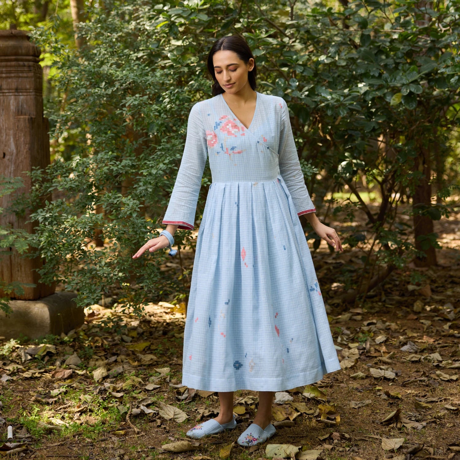 Turquoise blue cotton dress with intricate geometric Jamdani motifs above the hem, smaller Jamdani motifs in the sleeves and back